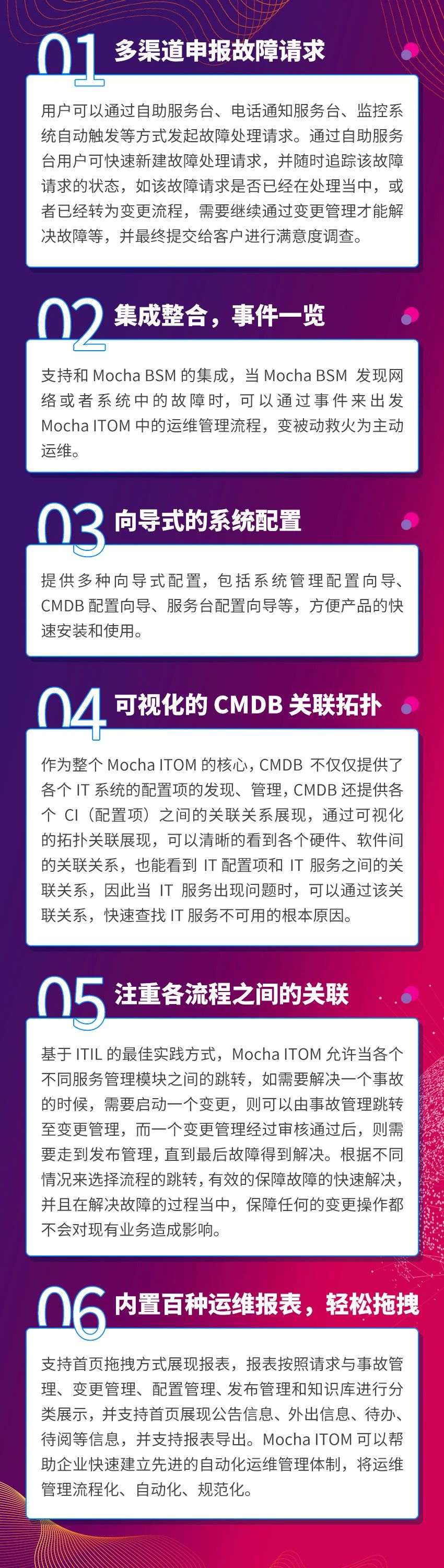 为了满足以上企业IT运维管理的需求,Mocha ITOM V8.0.0&Mocha Vmobile V3.0.0两大产品,全新上线和升级了请求与事故管理、问题管理、资产与配置管理、变更管理等15大功能。Mocha ITOM 基于 ITIL(IT Infrastructure Library)的最佳实践经验,为企业IT部门提供运维管理流程平台,并提供了基于 ITIL 的岗位定义、运维流程设计工具、运维表单设计工具、基于ITIL的流程模板和各种元素库,帮助企业在进行IT运维管理工作时,不仅能够有效的、有序的进行事故管理、问题管理、配置管理、变更管理、发布管理,达到服务支持的目的,也能够提供服务级别管理、可用性管理、能力管理,达到服务交付的目的。