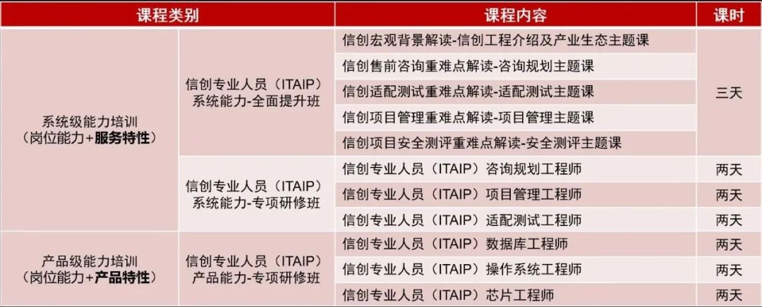 信息技术创新工作涉及面既广且深,不同行业、不同岗位从业人员的能力要求各不相同。华胜信创研究院结合具体的信创岗位能力,如“岗位+服务特性”的集成服务类能力(系统级的项目管理、咨询规划、适配测试等)、“岗位+产品特性”的通用产品类能力(如CPU设计、OS适配、数据库运维等),在系统级能力培训方向,打造信息技术创新专业人员(ITAIP)系统能力全面提升班、专项研修班,面向不同的人群提供定向的培训服务;在产品级能力培训方向,打造信息技术创新专业人员(ITAIP)产品能力研修班,针对各个不同产品领域,打造通用产品能力培训服务;并均可获得由工信部主管单位发放的相关认证证书。