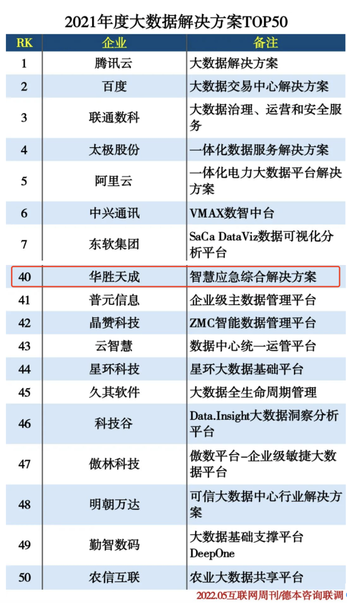 近日,中国科学院《互联网周刊》、德本咨询联合发布了《2021年度大数据解决方案TOP50》榜单。华胜天成集团“智慧应急综合解决方案”荣登榜单,充分肯定了其在大数据方面的领先性和卓越影响力。