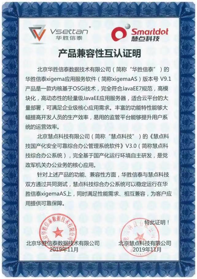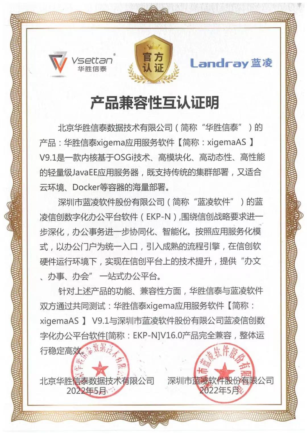 此次与国内主流OA软件产品平台进行兼容性互认证合作,通过华胜信泰xigema应用服务软件高可用、稳定可靠等优势,赋能政企办公自主可控,从而实现政务电子化信息互联互通、资源共享共用、业务高效协同。以下为部分产品兼容性互认证证书: