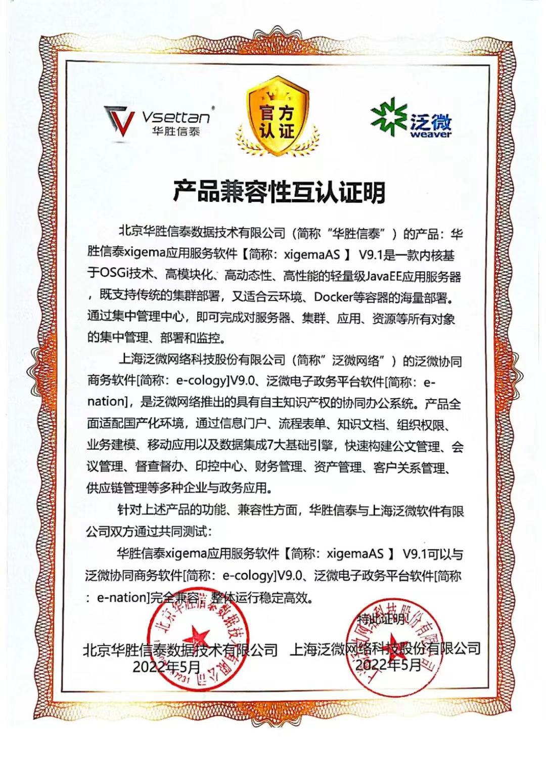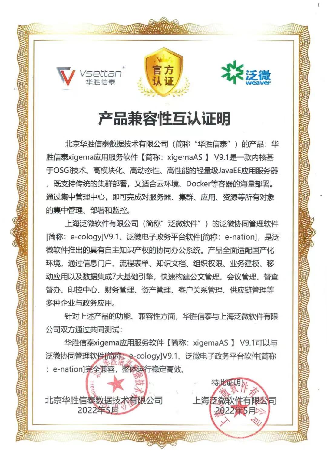 2、华胜信泰xigema应用服务软件【简称:xigemaAS】V9.1与泛微协同管理软件[简称:e-cology]V9.1(党政版本)、泛微电子政务平台软件[简称:e-nation]产品兼容互认证