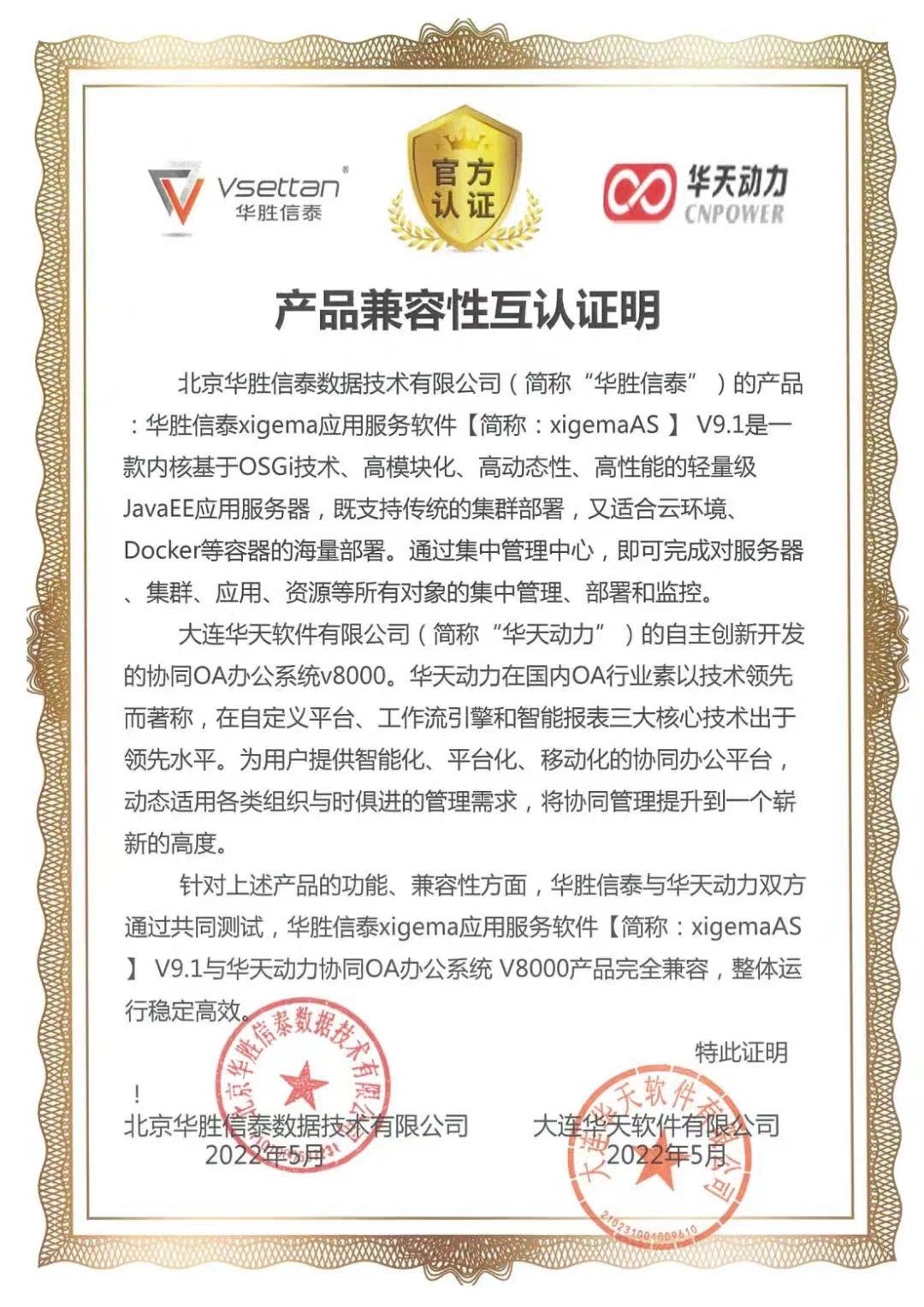华胜信泰xigema应用服务软件【简称:xigemaAS】V9.1与大连华天软件有限公司(简称“华天动力”)的协同OA办公系统v8000产品兼容互认证