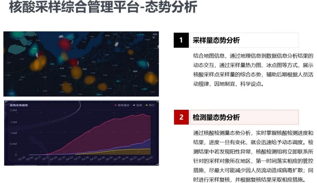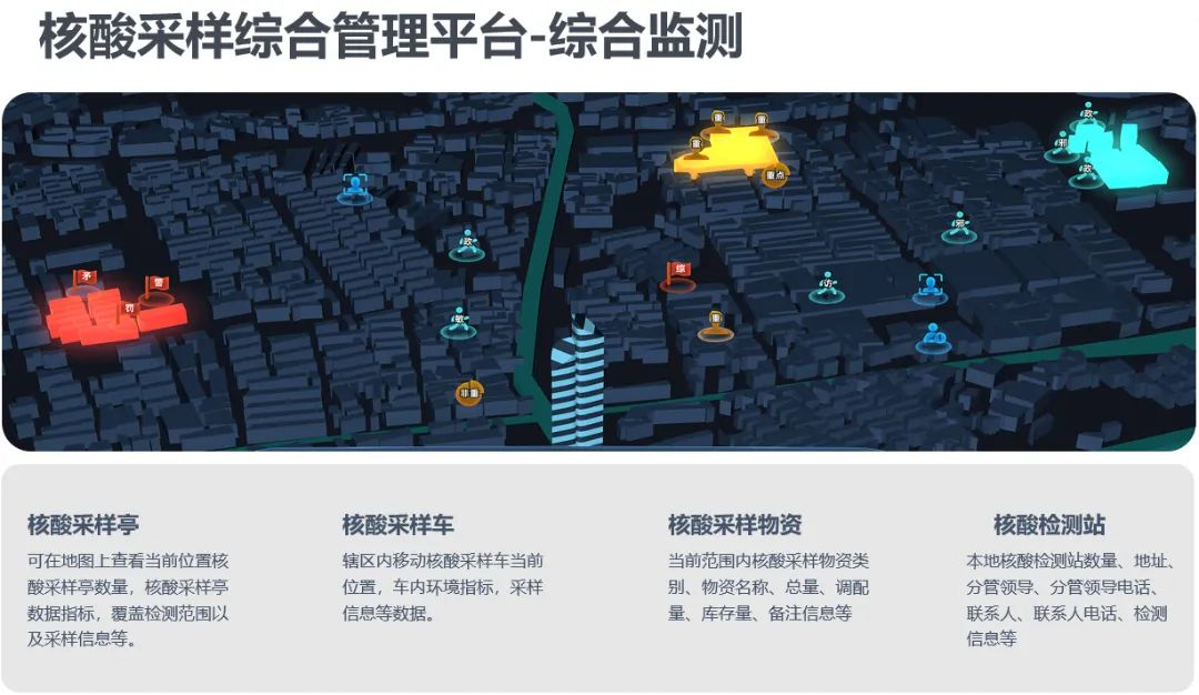 全面监测各核酸采样亭、核酸采样车、采样物资和核酸采样站的数据信息,并进行数据分析与加工,依据防控管理要求进行风险监控及预警机制,追踪、监控与分析关键数据的波动情况和相关事件的应对效果,形成综合监测驾驶舱,对各种状况进行精准定位,实现分层、分级的综合管理,助力疫情管理策略,提升疫情防控管理水平。