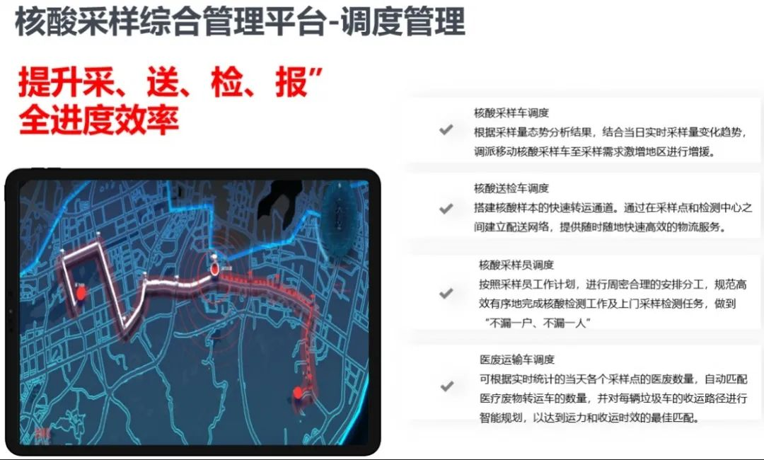 实现采、送、检、报统筹管理,提升全进度效率,聚焦于各单元数据信息处理、个性化功能设计及质量与工作管理等方面,通过管控平台的数据处理分析及程序,替代原来的人工统计部分,将采样监控及预警、检测任务分析、送检快速分配、医废运输智能规划等智能化工具嵌入管理模块并进行多维度展现,提高突发事件发现能力及调度能力。