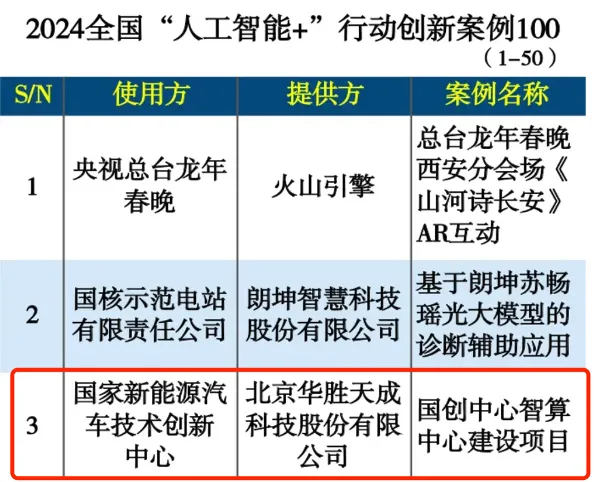 华胜天成入选2024全国“人工智能+”行动创新案例榜单前三