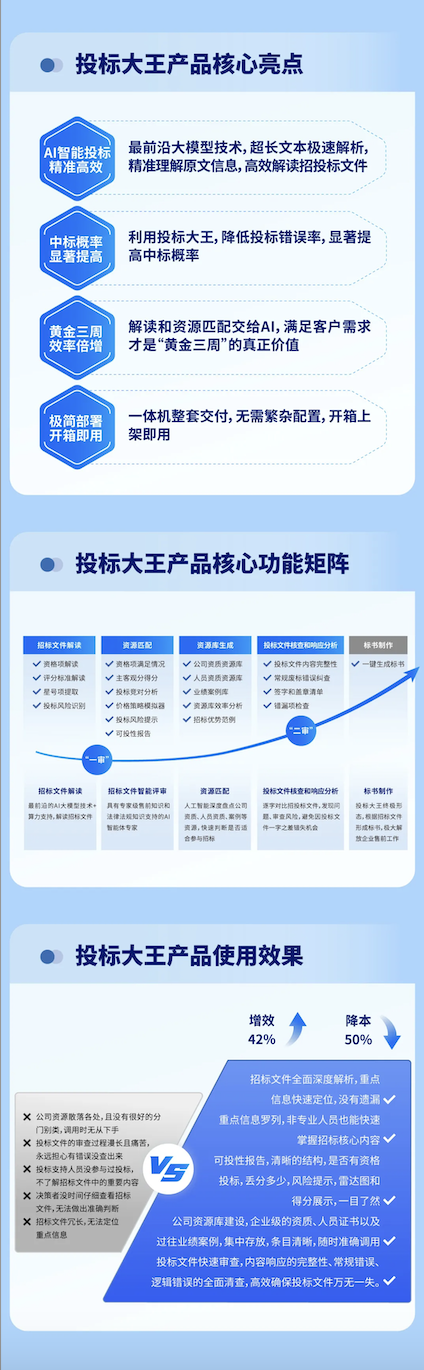 随着AI和大模型的发展,华胜天成提前洞察技术趋势,精准把握市场脉搏,凭借26年的IT服务经验,专注于政府、金融、制造等十多个行业,每年参与数千次投标,累计完成上万个项目,积累了丰富的投标经验和大量数据,拥有经验丰富的解决方案和售前团队,能够精准把握客户需求,在设计产品时能真正站在投标人角度融入对场景的理解。同时,加之华胜天成在大模型技术方面的优势,将AI技术与投标业务实际需求紧密结合,推出了“投标大王一体机解决方案”,真正实现了大模型的场景化落地。这是一款AI驱动的企业投标智能系统,具备智能评审、资源匹配、风险评估和标书审核等多项强大功能,同时,可自行对海量数据进行分析和深度学习,提供精准的决策支持,帮助企业节约审标时间、降低投标错误、提升中标率。