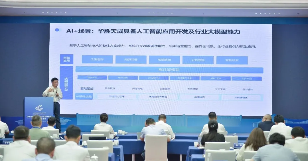王维航在演讲中指出,随着数字经济与实体经济的加速融合,各地纷纷提速数字经济的发展步伐,力求在全球竞争中抢占先机,推动产业的深度转型升级。在这场变革浪潮中,算力、算法、数据作为新型生产力的核心支撑,已成为推动经济发展的关键动能,催生出全新的产业形态和商业模式。随着新一轮科技革命和产业变革的深入演进,华胜天成AI转型战略全面启动,致力于通过“算力、场景、生态”三大核心抓手,深入推进人工智能的应用与发展,特别是在AI与算力基础设施建设方面的深度融合。目前,华胜天成在AI+算力领域的布局已取得显著成果,具备从智算中心建设、运维到运营的全方位能力,并已在天津河北区、山东济南历下区、江西南昌红谷滩区联合本地政府相继建设并交付了区域人工智能计算中心。同时,在安徽宿州打造了国创智算中心项目,专注于新能源汽车领域的高水平人工智能算力基础设施建设,推动了我国智算产业的深入发展。